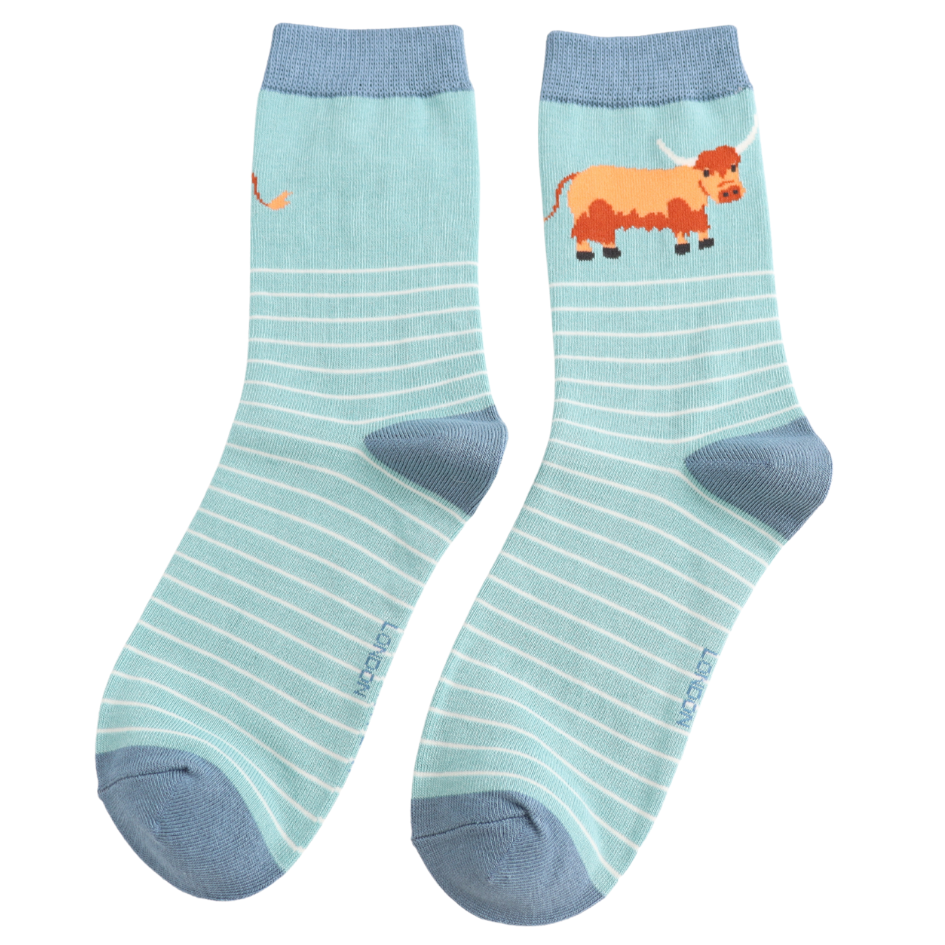 Highland Cow & Stripes Socks Duck Egg